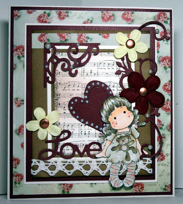 Hello - today will be a short note as it has been so busy for me lately. Even though I have been busy I did manage to get a card made - I find that when life becomes overwhelming I need to go and make time for myself in my craft room and that is what I did this past weekend. Since Valentines Day is just around the corner I figured this card would be suitable. I love this Tilda and the reason I love her so much is her versatility, I have used her before for Christmas cards and she would work so well with almost any other type of occasion. I used sizzix dies for the corner on the top left side, the love sentiment and the heart behind Tilda and memory box for the swirls on the right side of the card behind the flowers. I am not sure where I got the background musical stamp from (it is actually a Christmas stamp and if you look real close at the words it is the words to jingle bells - lol!!) But I doubt anyone will notice - the words are pretty tiny. I also used the background paper from the new Magnolia magazine - it is so pretty!! Well that pretty much does it for today's post - hope you are enjoying your day wherever that may be - we have been experiencing unusually mild almost spring like weather here where I live and I am loving it - bye for now and happy cardmaking!!